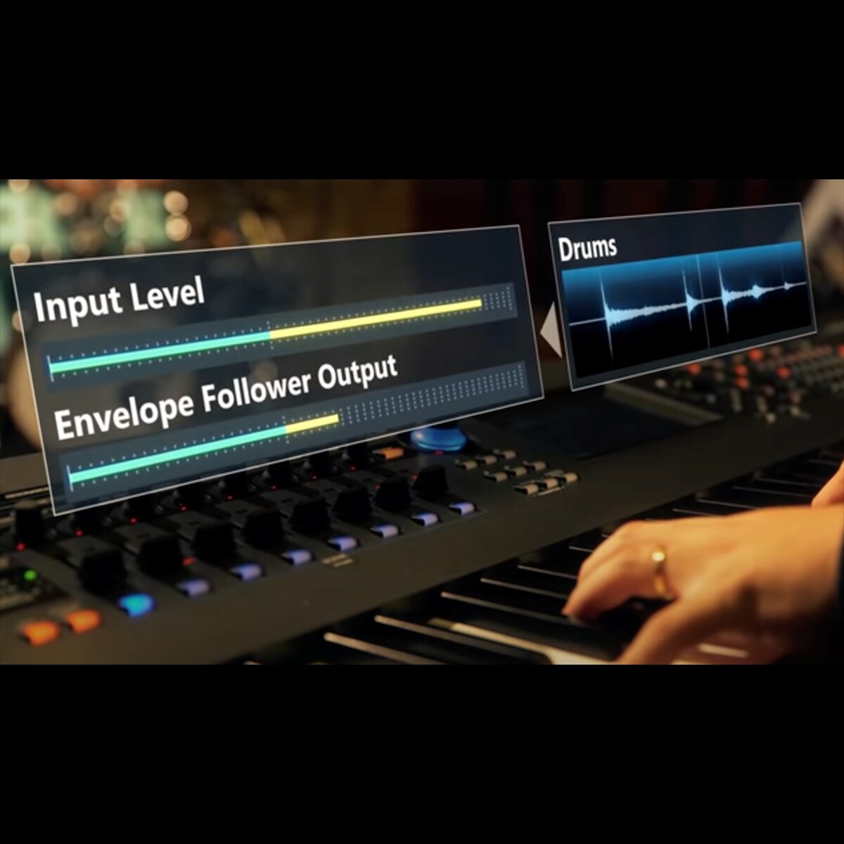 The Envelope Follower converts audio into a control source for control of virtually any synthesizer parameter. For example, a drum loop could drive effects parameters for a cool rhythm or a vocal recording could control multiple parameters for a “talking” synthesizer. The audio can even be a “live” source through the A/D input.