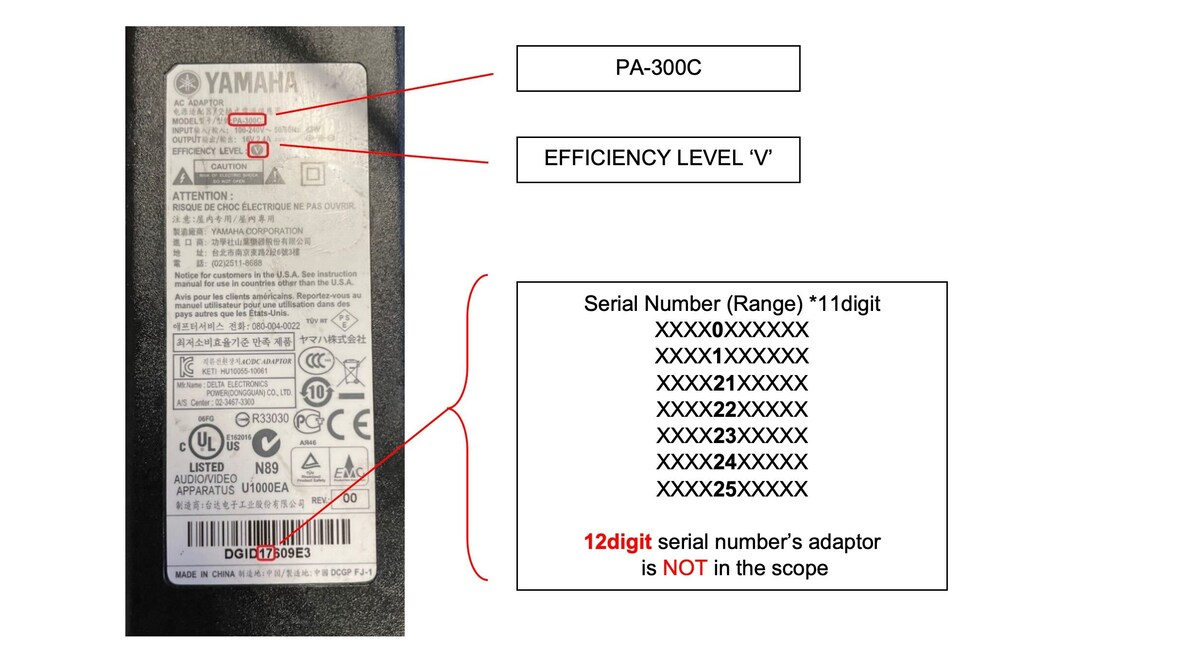 Kun PA-300C AC-strømadapteren tilbagekaldes. Adapteren blev solgt sammen med visse digitale instrumenter og musikprodukter, der er angivet nedenfor. Adapteren blev ikke solgt separat. Derudover var adapteren indbygget i visse digitale klaverer i YAMAHA CLAVINOVA CLP-serien og CVP-serien.